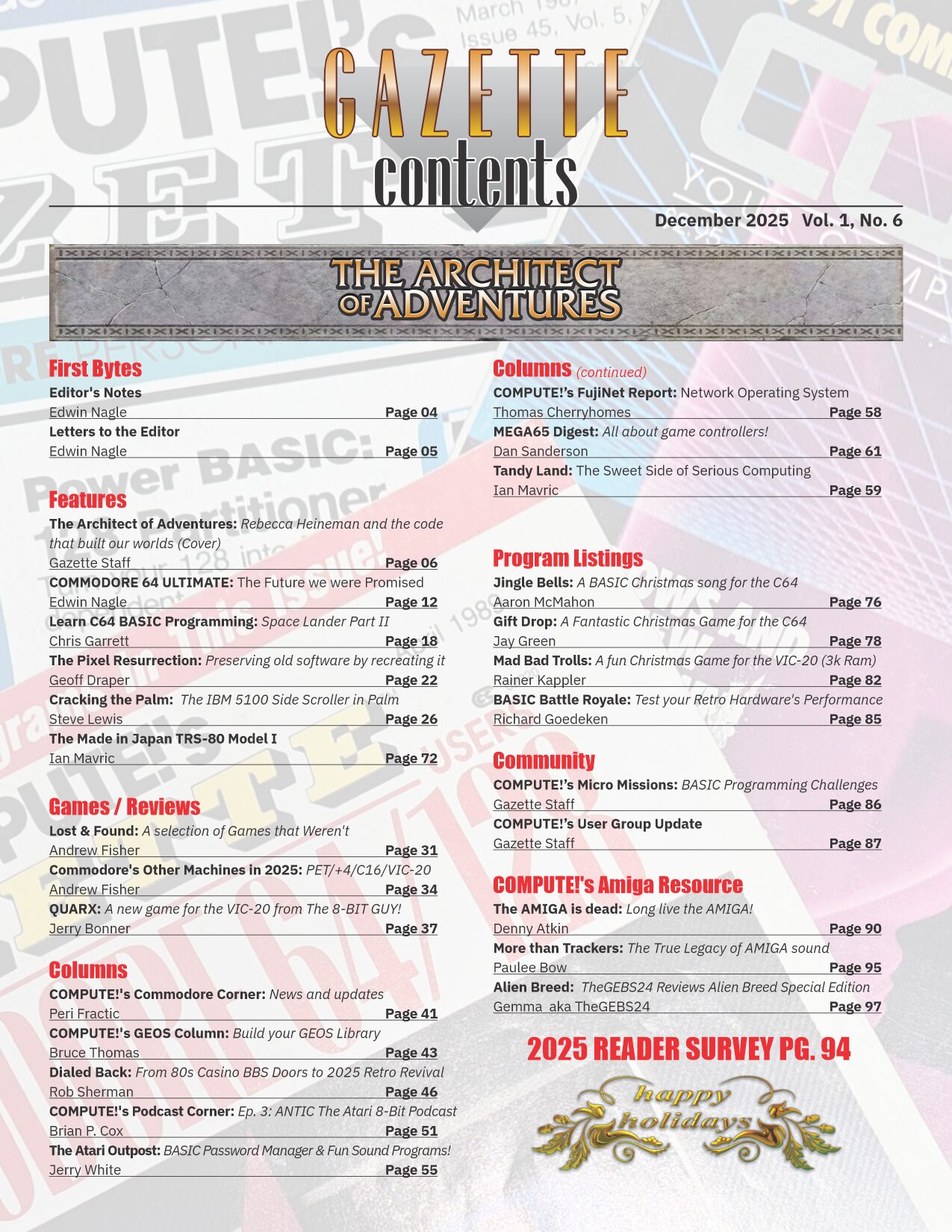 Close out the year with a landmark issue of COMPUTE!’s Gazette. The December 2025 edition balances a heartfelt tribute to a coding legend with an exciting look at the next evolution of Commodore hardware. This issue is packed with 100 pages of type-in programs, hardware reviews, and deep-dive technical articles for the Commodore, Amiga, Atari, and TRS-80 communities.